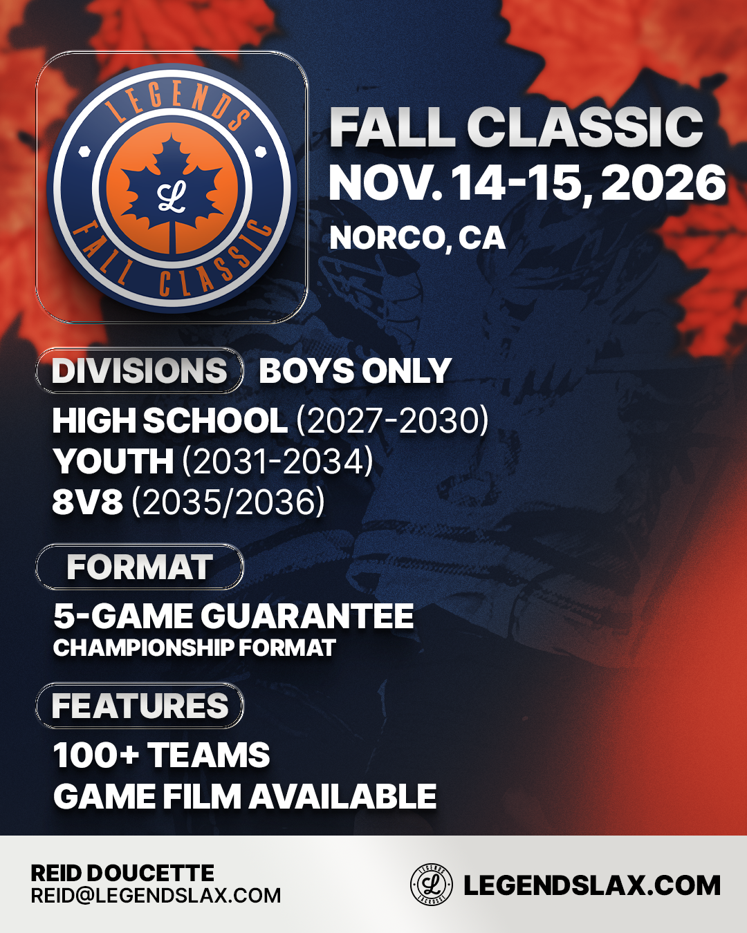 - To enter a team or for general event inquiries contact Reid Doucette Reid@LegendsLax.com