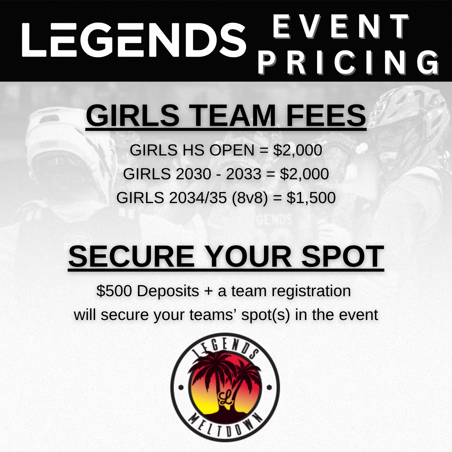 Any schedule requests must be submitted in writing to events@legendslax.com at least 30 days prior to the start of the tournament. Schedule requests are not guaranteed but Legends will do our best to accomodate if received within the timeframe.