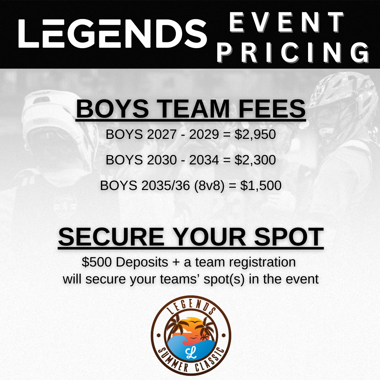 Any schedule requests must be submitted in writing to events@legendslax.com at least 30 days prior to the start of the tournament. Schedule requests are not guaranteed but Legends will do our best to accomodate if received within the timeframe.