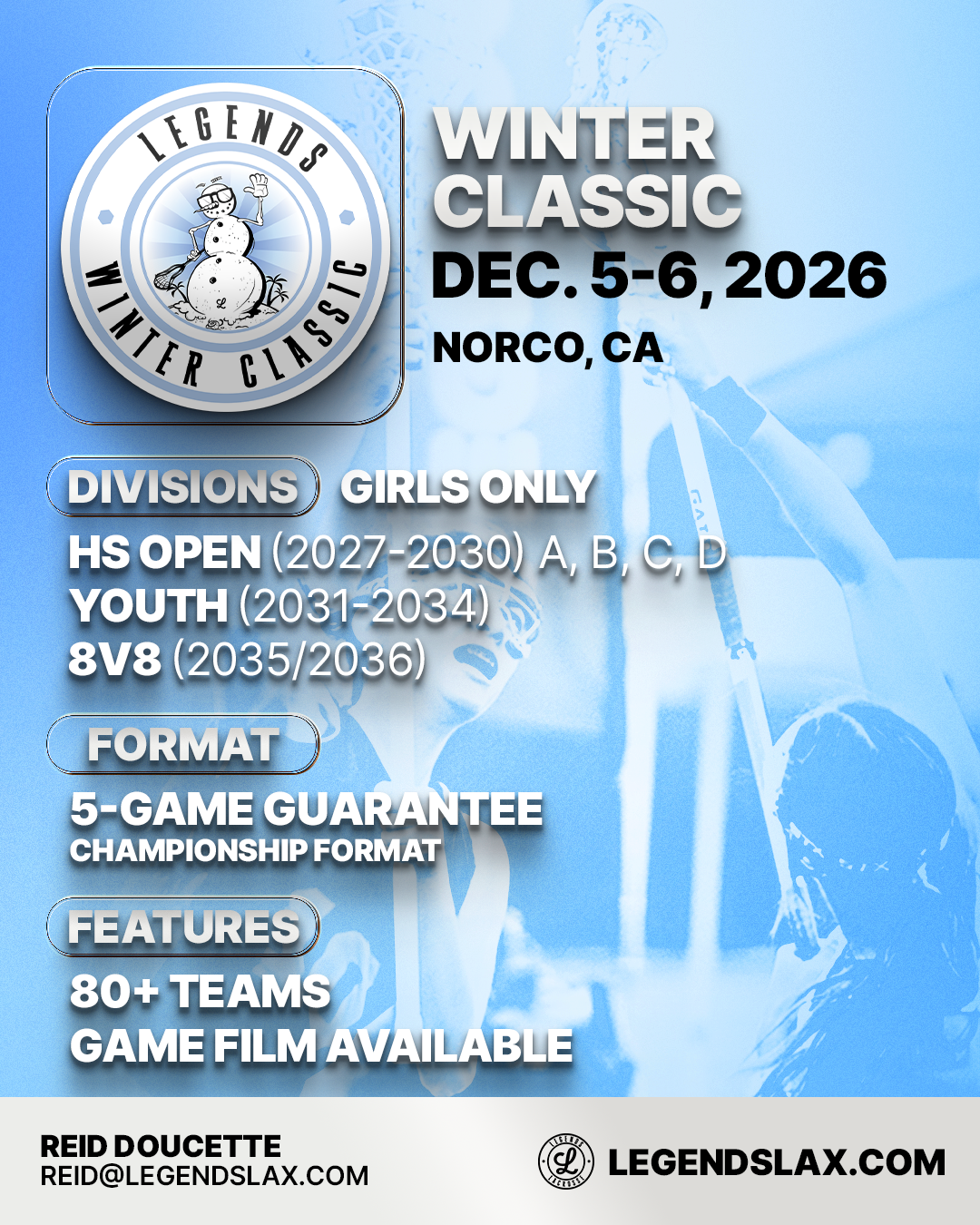 - To enter a team or for general event inquiries contact Reid Doucette Reid@LegendsLax.com